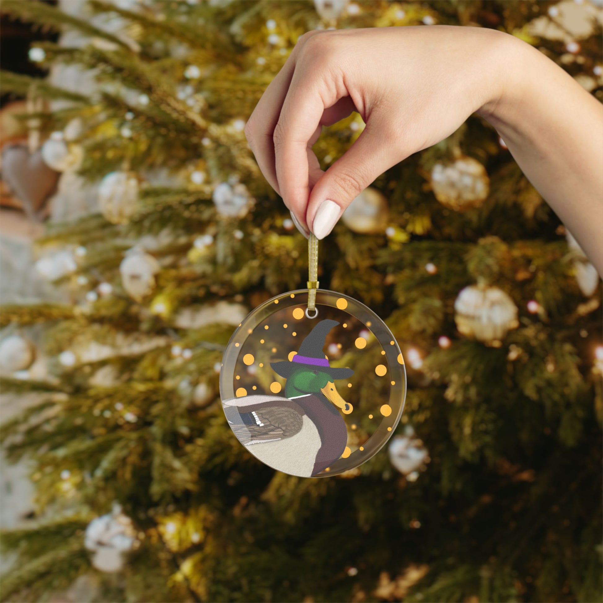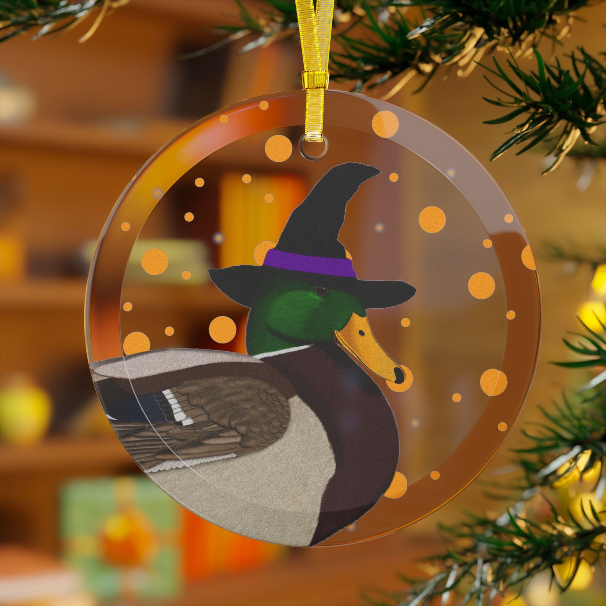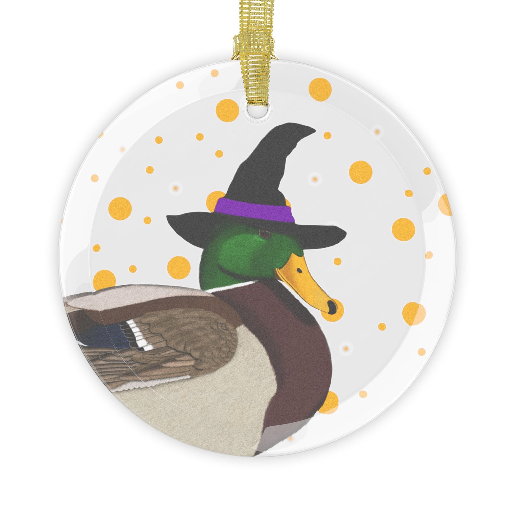 This glass ornament features a funny Halloween Mallard bird design. A perfect addition to your holiday decor, this ornament brings a touch of whimsy and charm to any space. Makes a great gift for bird lovers and anyone who loves unique Halloween decorations.