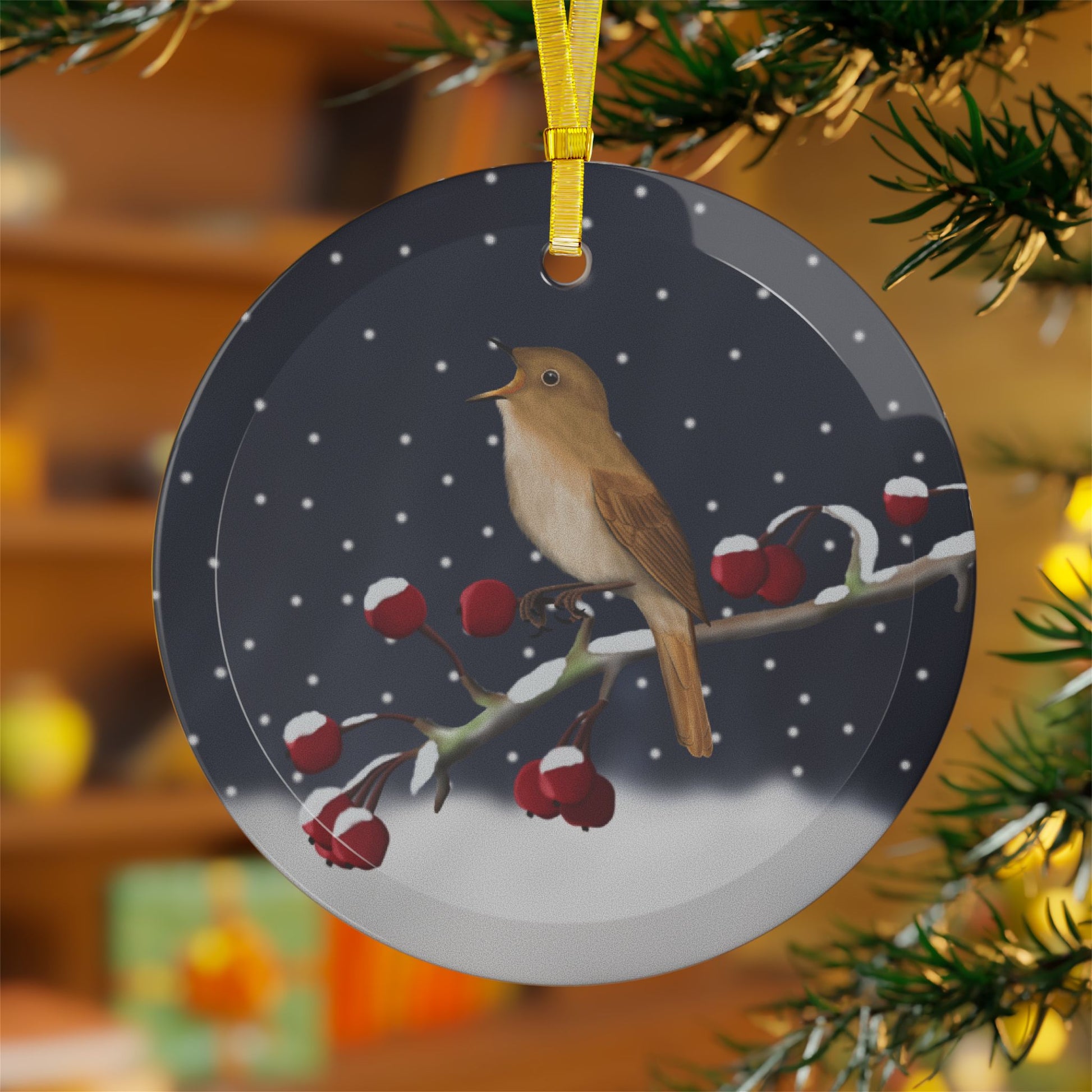 Nightingale on a Winter Branch Christmas Bird Glass Ornament