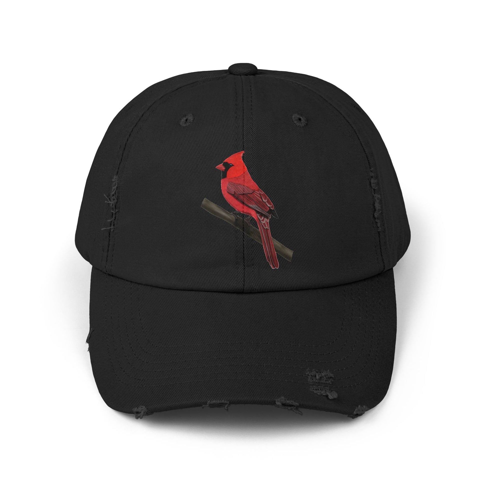 This distressed cap is the perfect accessory for birdwatchers. Its rugged appearance adds to the experience of being out in nature, while also being functional. Showcase your passion for bird art with this unique Northern Cardinal cap.