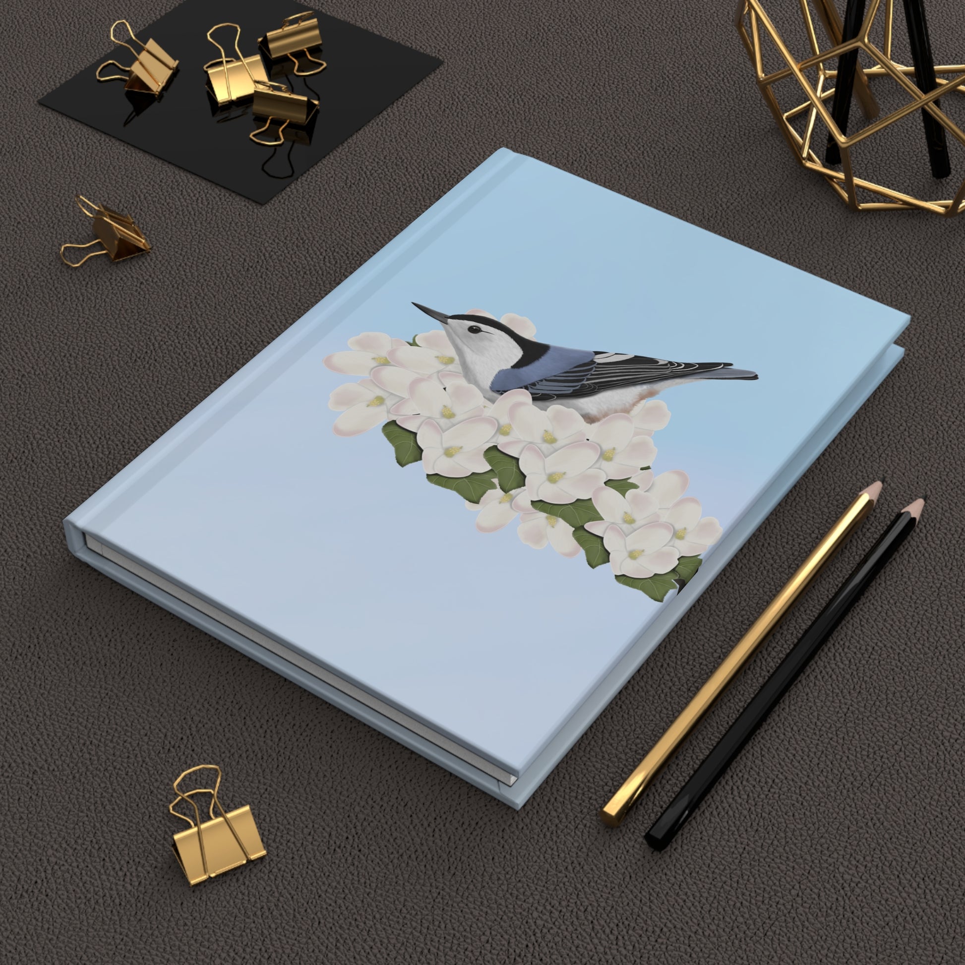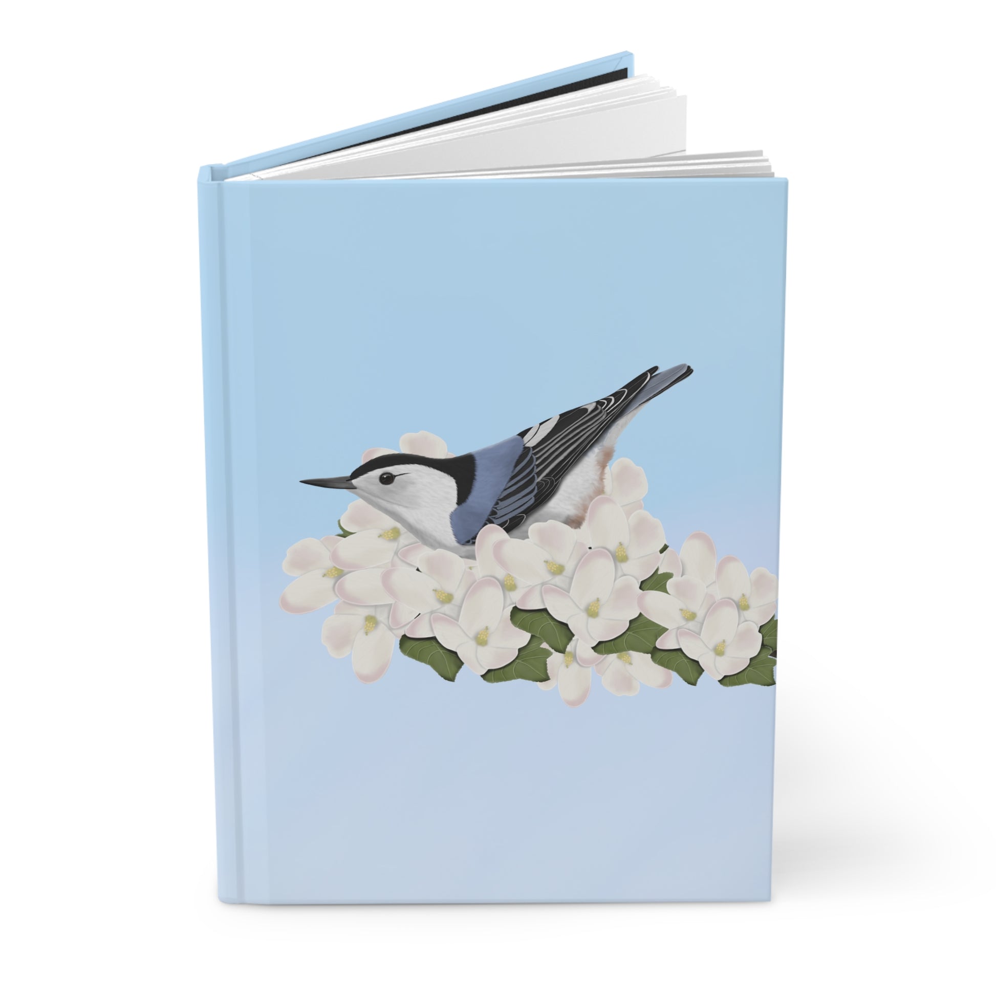 A hardcover journal featuring a beautiful Nuthatch bird design, perfect for birdwatchers and bird lovers. The matte laminated cover provides durability while the vibrant colors make the design pop. With 150 lined pages, this journal is perfect for taking notes or doodling on the go. A great gift for bird enthusiasts and those who appreciate backyard birds.