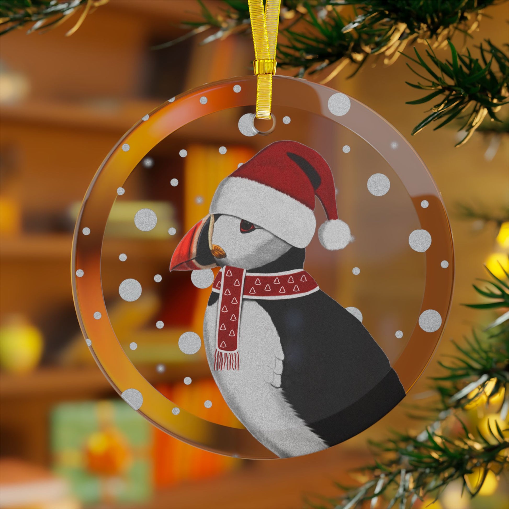 This glass ornament features a festive Christmas Puffin design, with a bird dressed as Santa Claus. A perfect addition to your holiday decor, this ornament brings a touch of whimsy and charm to any space. Makes a great gift for bird lovers and anyone who loves unique Christmas decorations.
