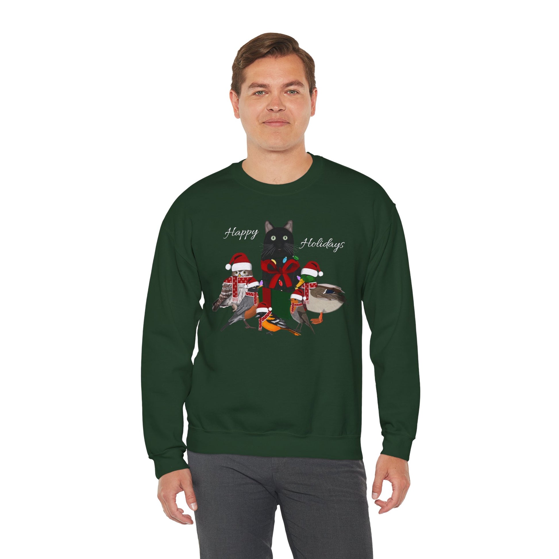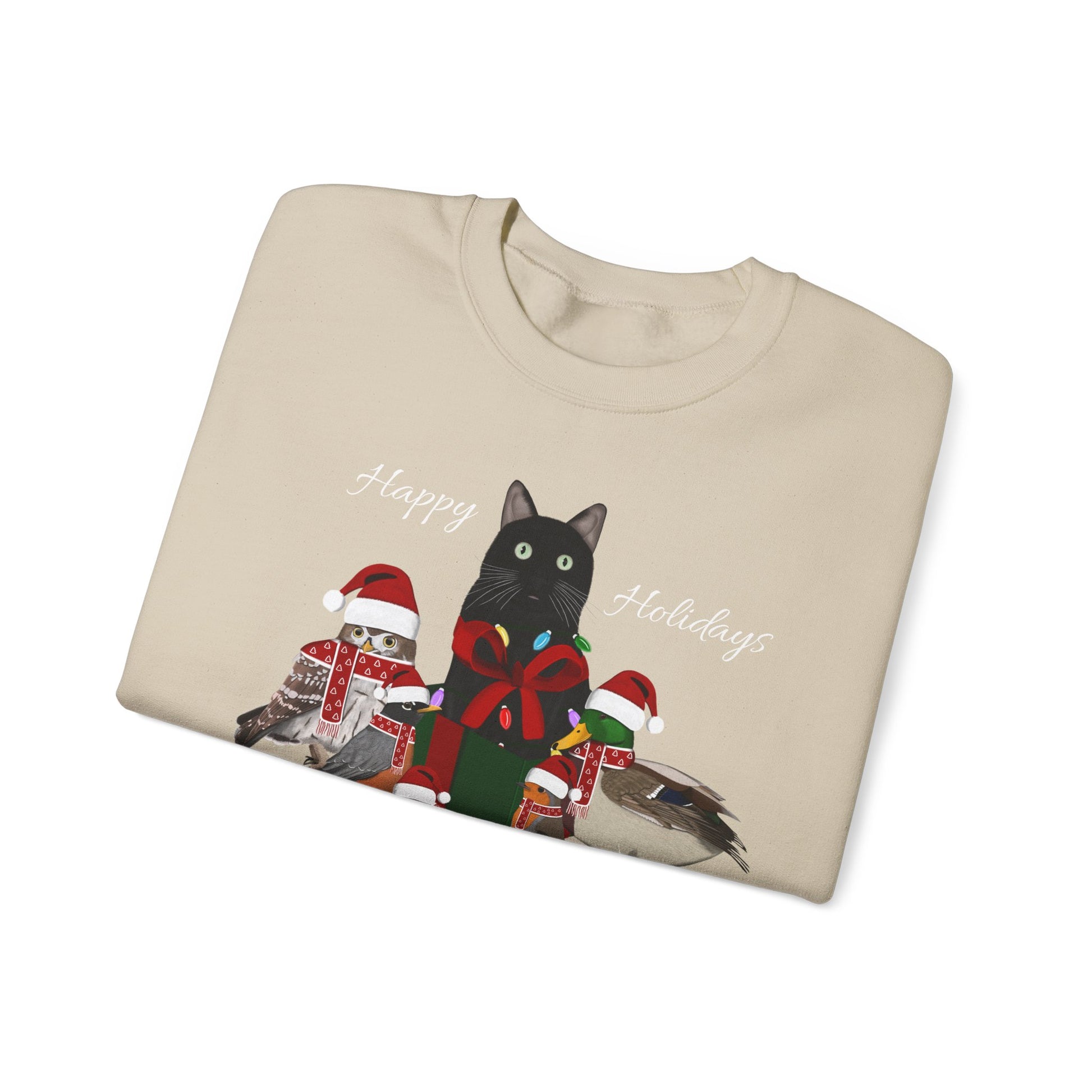 Robin Mallard Oriole Owl with Cat in a Box and Fairy Lights Happy Holidays Christmas Bird Sweatshirt