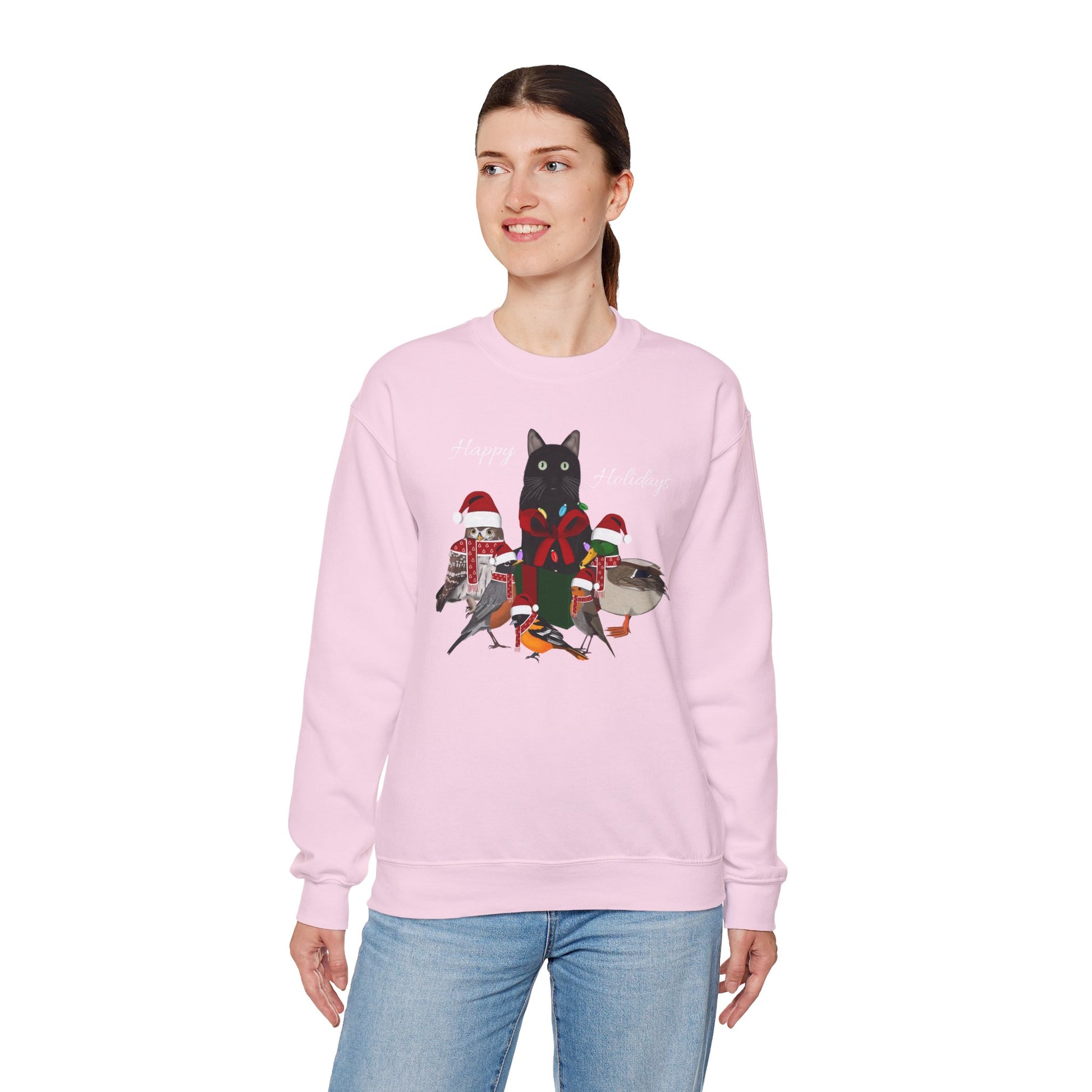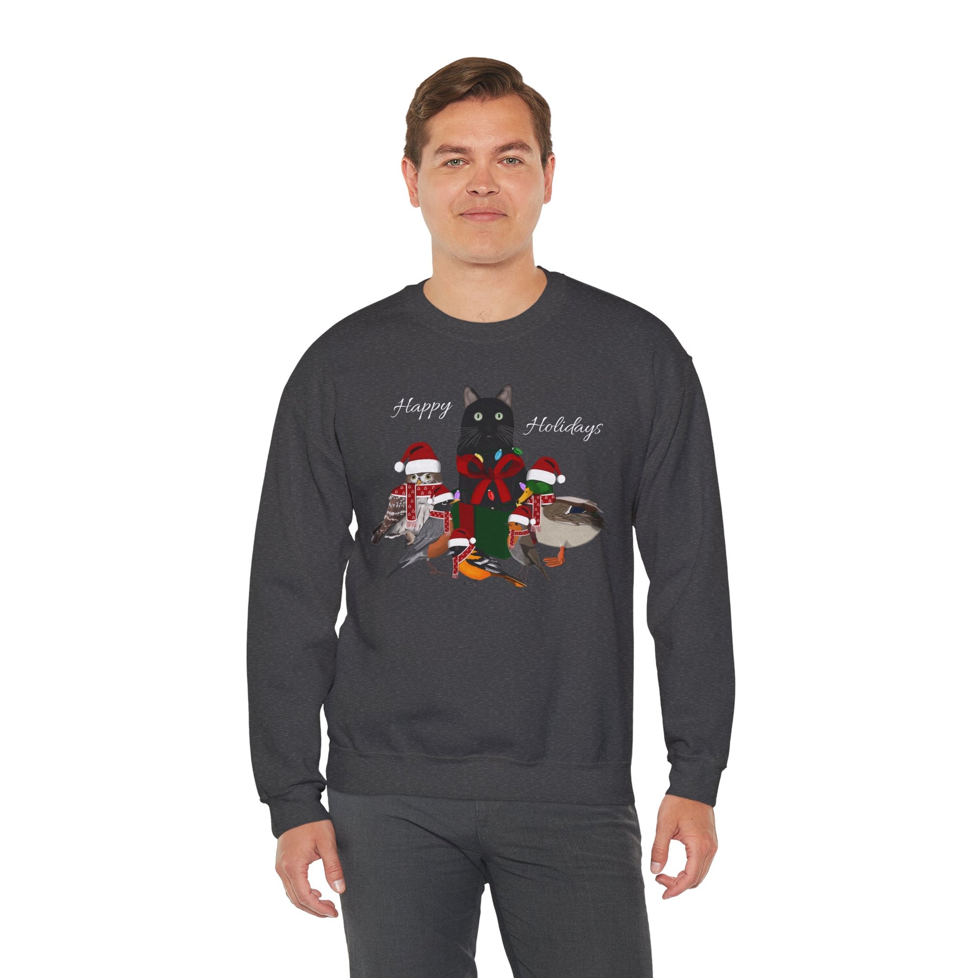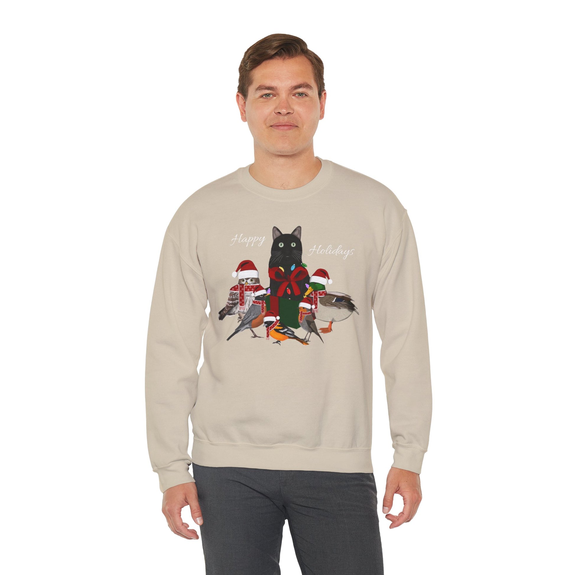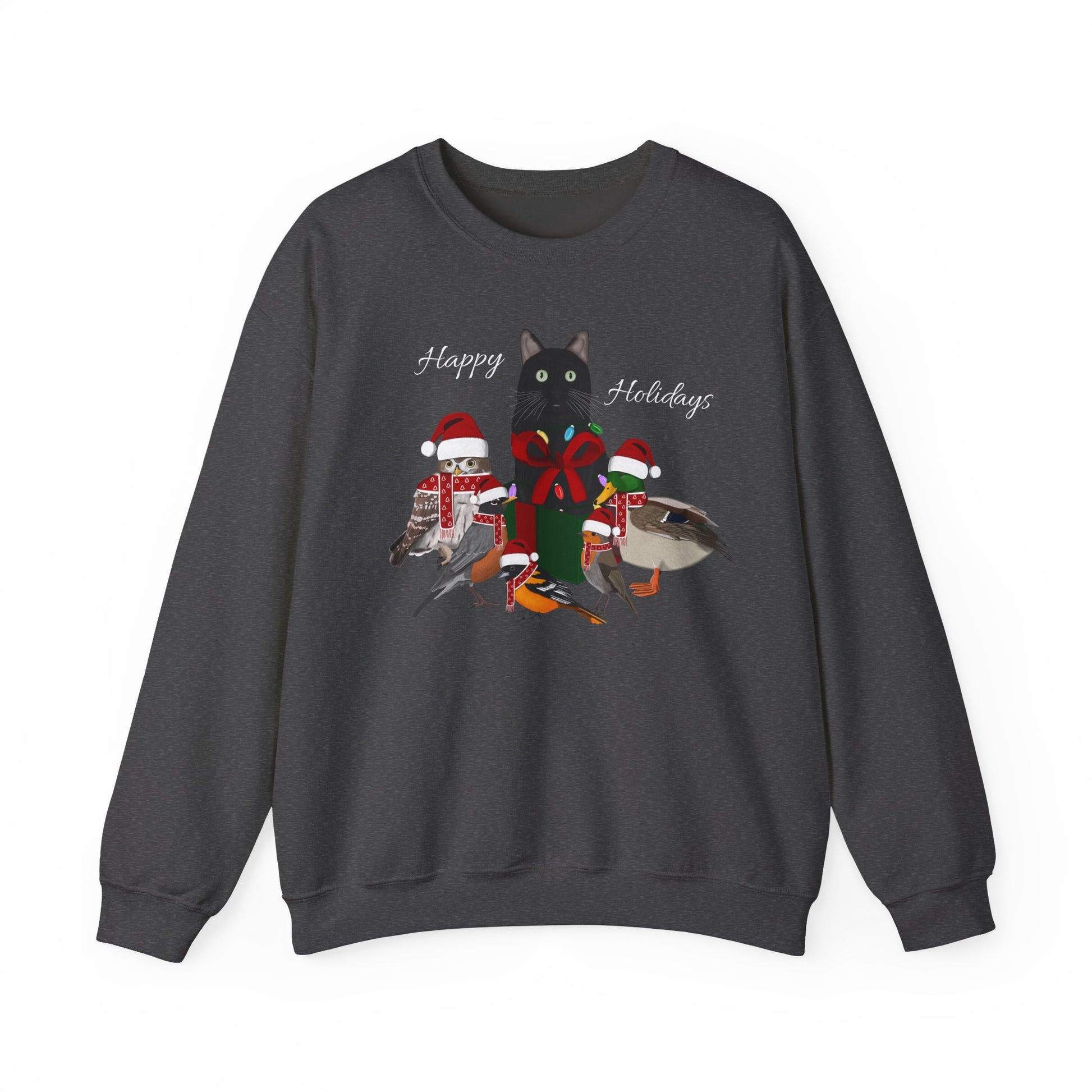 Show off your love for Christmas and birds with this unique backyard birds sweatshirt. Featuring a funny Robin, Mallard, Oriole, Owl with Cat in a Box and Fairy Lights Happy Holidays bird design, this is the perfect gift for any birdwatcher or a fun addition to your Christmas outfit. Spread some holiday cheer with this cute and stylish design.