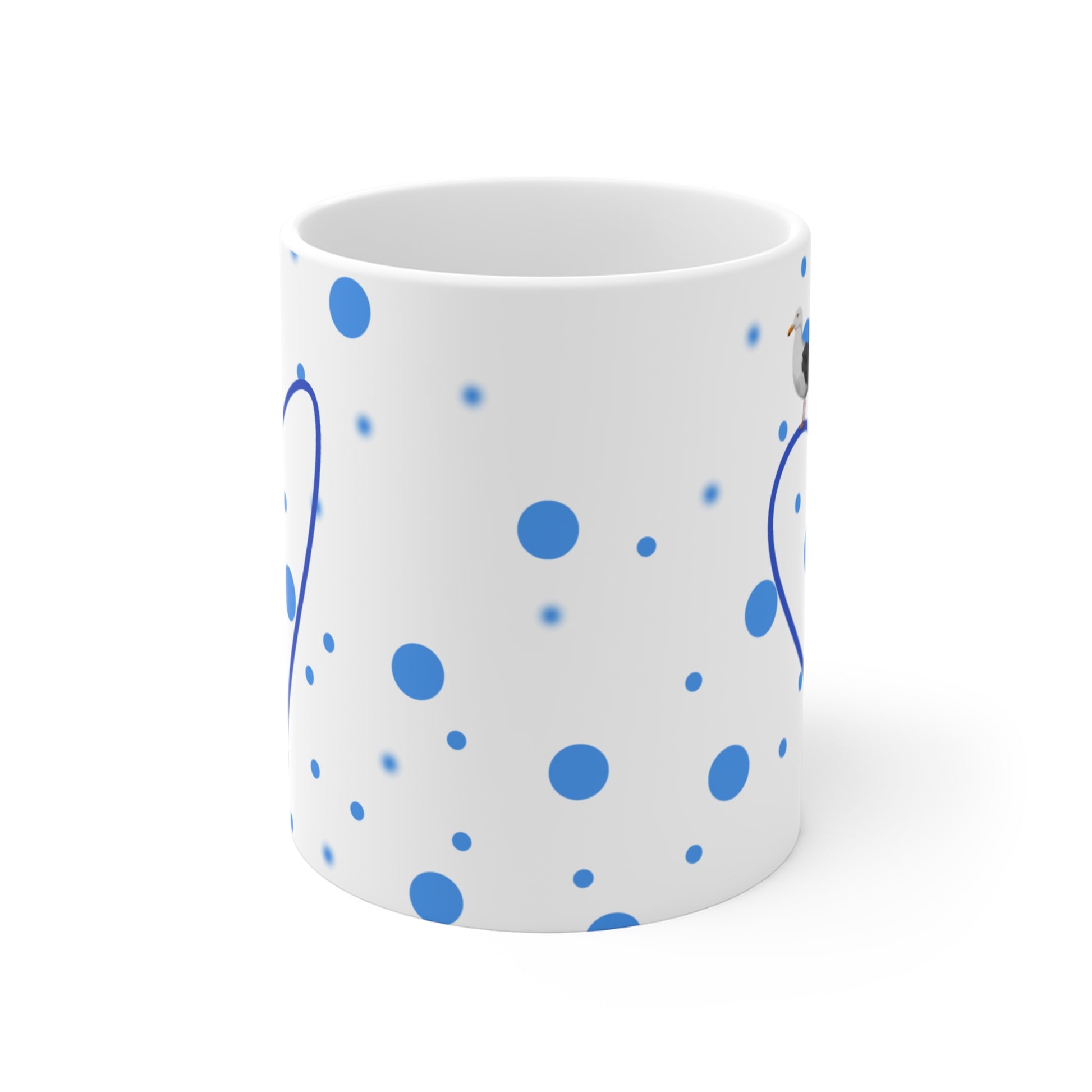 This Valentine's Day mug features a blue heart design and a charming seagull bird illustration, perfect for birdwatchers and bird lovers. Enjoy your morning coffee or tea while celebrating this special day.