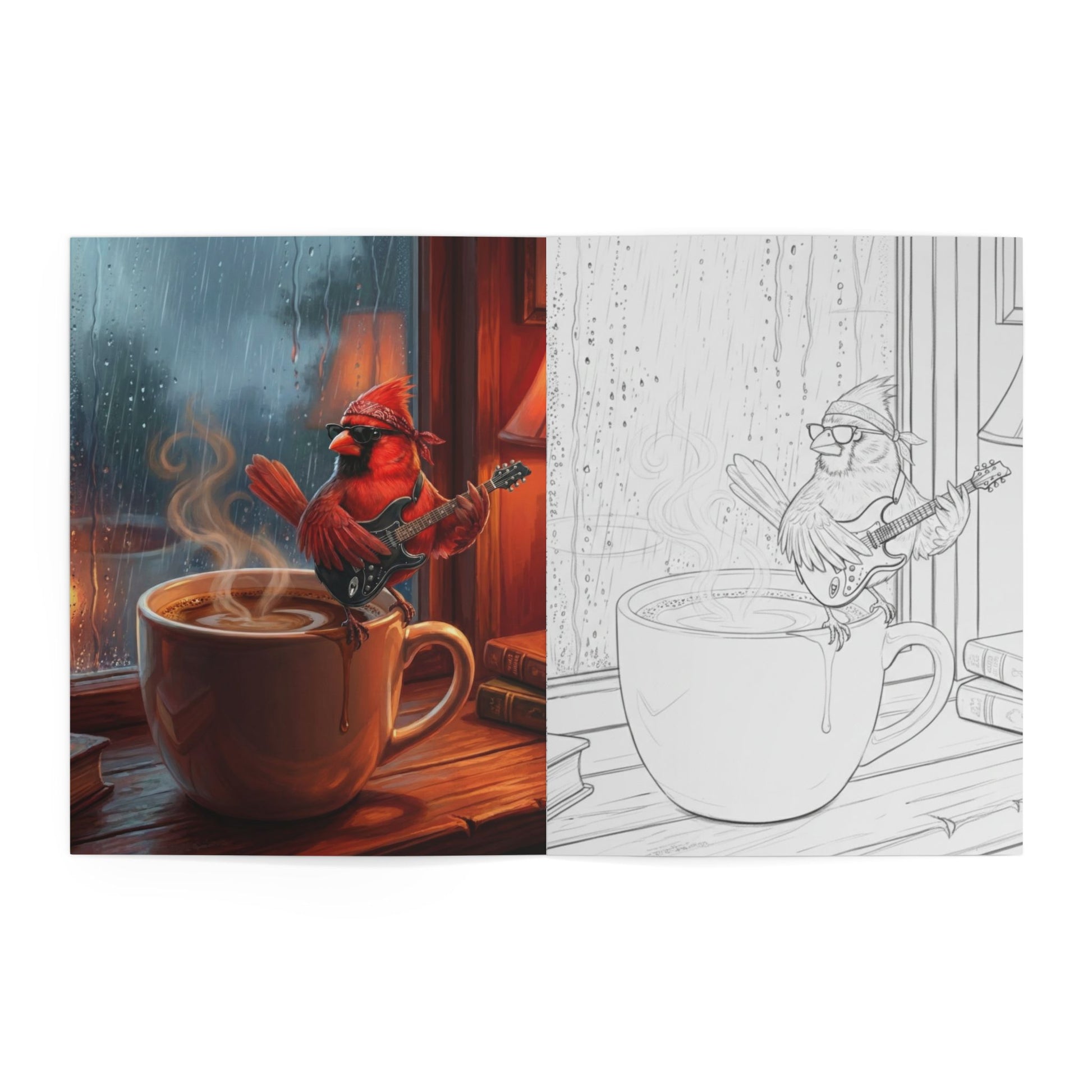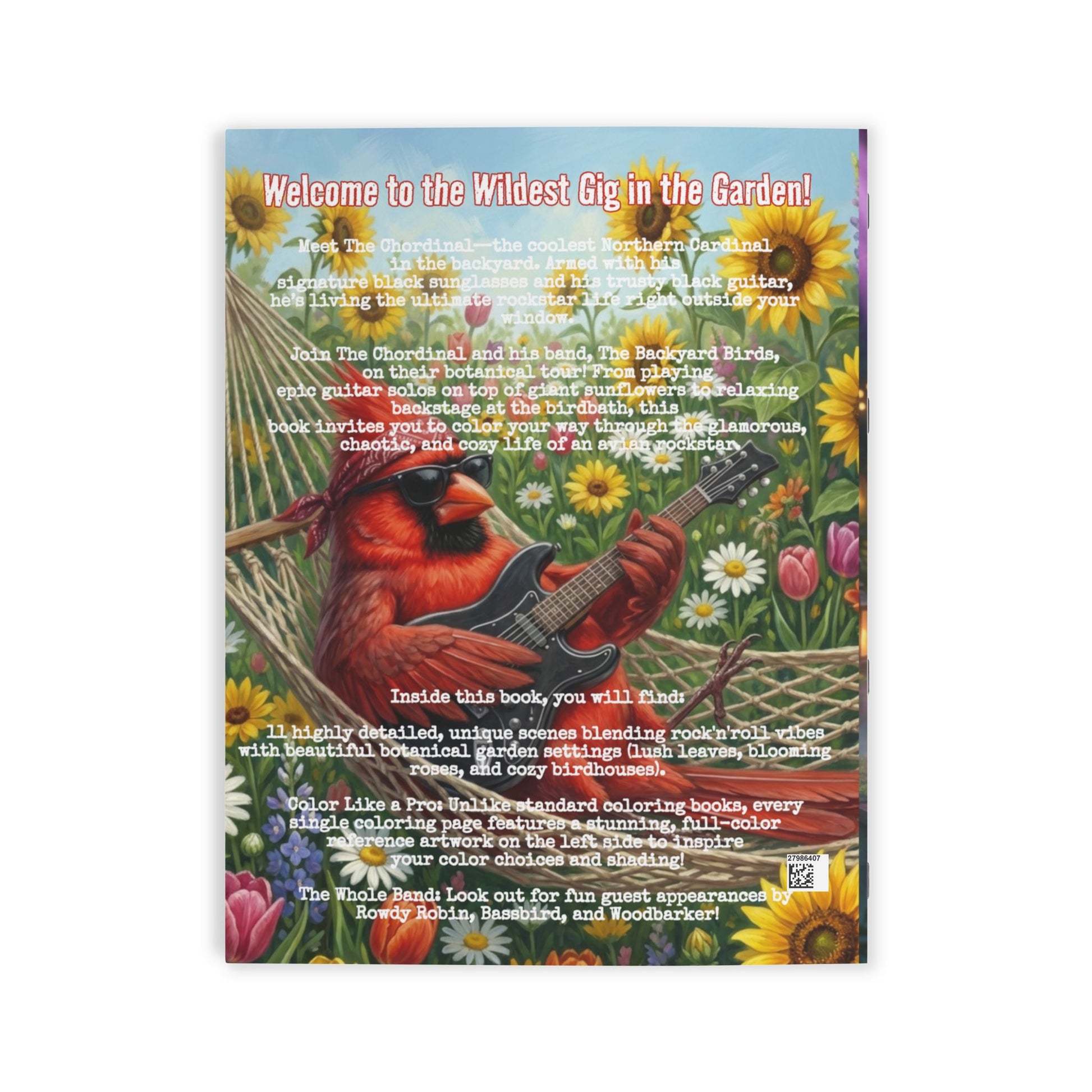 Join The Chordinal and his band, The Backyard Birds, on a botanical tour! From playing epic guitar solos on top of giant sunflowers to relaxing backstage at the birdbath, this premium coloring book invites you to color your way through the glamorous, chaotic, and cozy life of an avian rockstar.