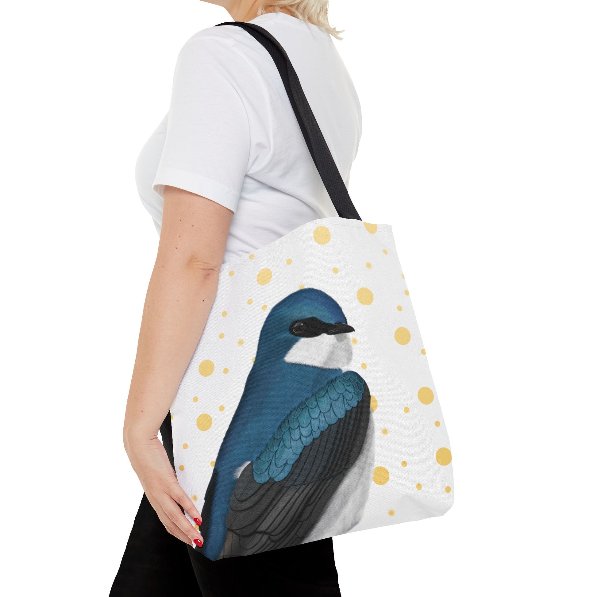 Experience the joy of birdwatching with our Tree Swallow Bird Tote Bag! Measuring 16"x16", this stylish bag features vibrant golden dots and is perfect for carrying all your birdwatching essentials. Whether you're a seasoned birder or just starting out, this bag is a must-have for all bird enthusiasts.