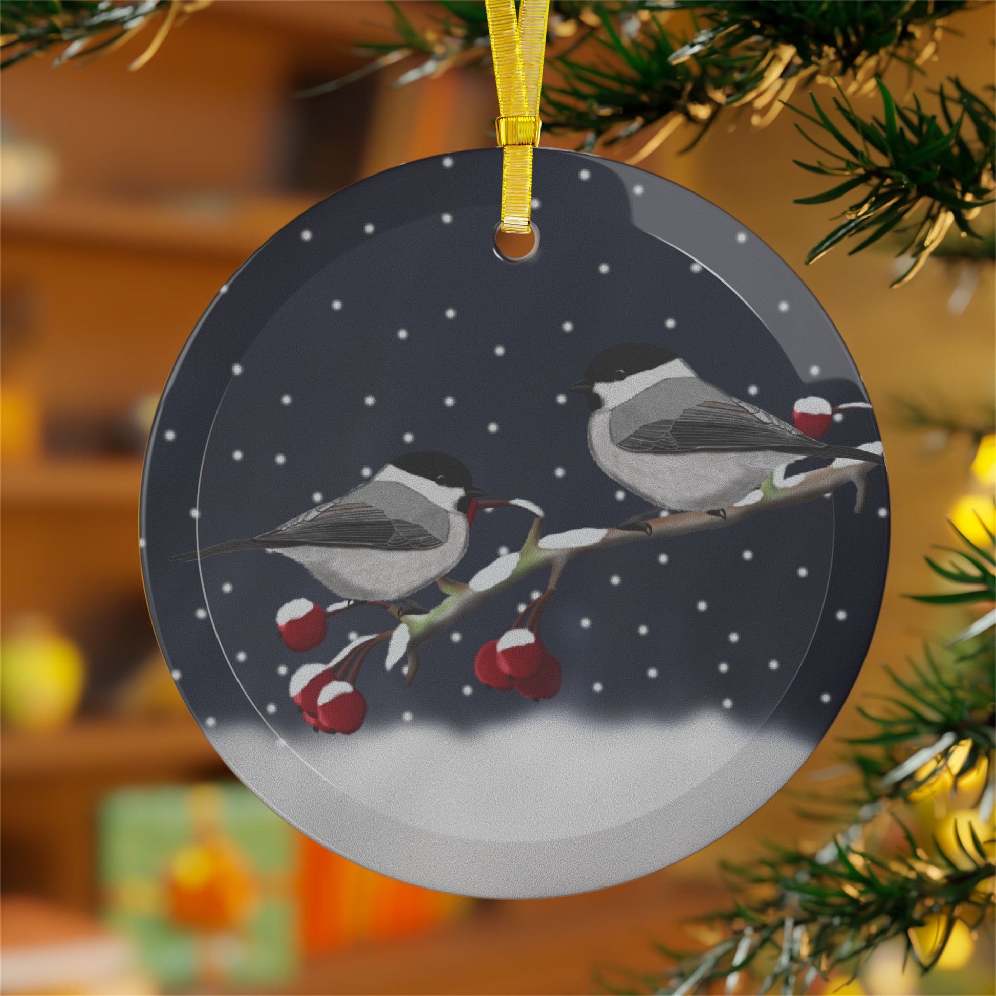 This glass ornament features a festive Willow Titmice on a Winter Branch Christmas design. A perfect addition to your holiday decor, this ornament brings a touch of whimsy and charm to any space. Makes a great gift for bird lovers and anyone who loves unique Christmas decorations.