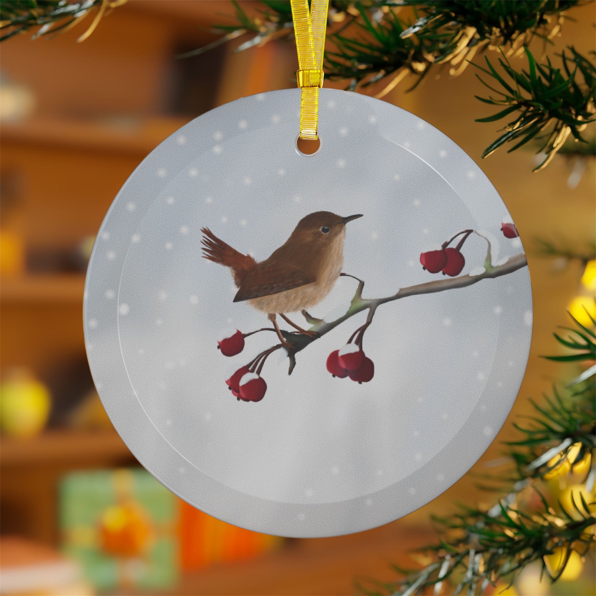 This glass ornament features a festive Christmas Wren design. A perfect addition to your holiday decor, this ornament brings a touch of whimsy and charm to any space. Makes a great gift for bird lovers and anyone who loves unique Christmas decorations.